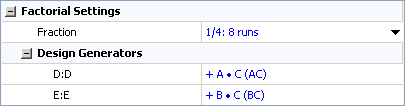 Since a fractional design is being used, you must choose Design Generators for the last two factors. Since it is assumed that the interaction effects AC and BC are not significant, you choose to alias the main effect of D with the interaction effect AC, and the main effect of E with the interaction effect BC, as shown next.