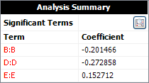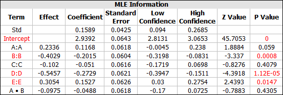 To see the coefficients for all the terms in the regression model, click the View Analysis Summary icon and view the MLE Information table.