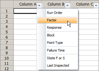 The following kinds of information can be recorded in each column. To calculate, there must be at least one Factor column and at least one Response or Failure Time column. All the possible columns are described next.