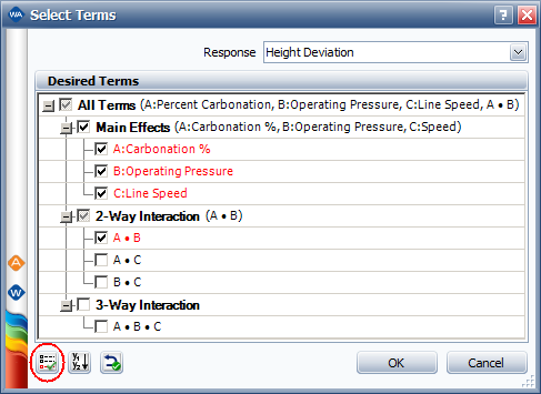 In the Select Terms window that appears, click the Select Significant Effects button to select only the significant effects to calculate the new model, as shown next, then click OK.