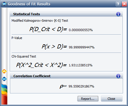 The Goodness of Fit Results utility performs statistical tests to determine how well the parameters of the distribution fit the data. Note that this utility can only be used to evaluate data sets that do not contain censored data.