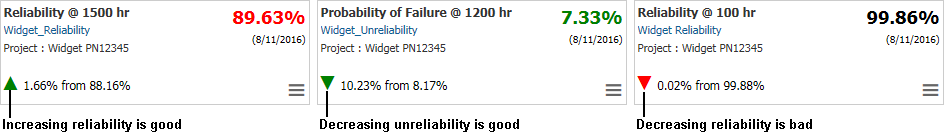 The Target Conditions feature color-codes the current value of the metric. If all specified conditions are met, then the metric's value will be displayed in green. If one or more conditions are not met, then it will be in red. For example, in the following pictures, the result is green if the estimated system reliability is at least 80%, and red if it is not.