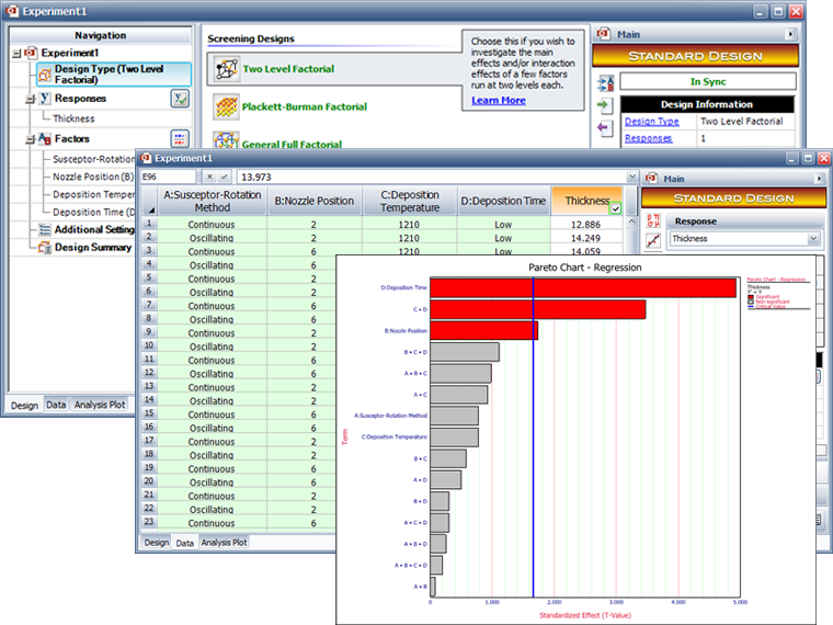 A set of Design folios provide techniques for DOE analyses such as identifying key factors that affect performance (standard design), minimizing a system’s sensitivity to noise (robust design) and determining the best proportion of components in a mixture (mixture design).