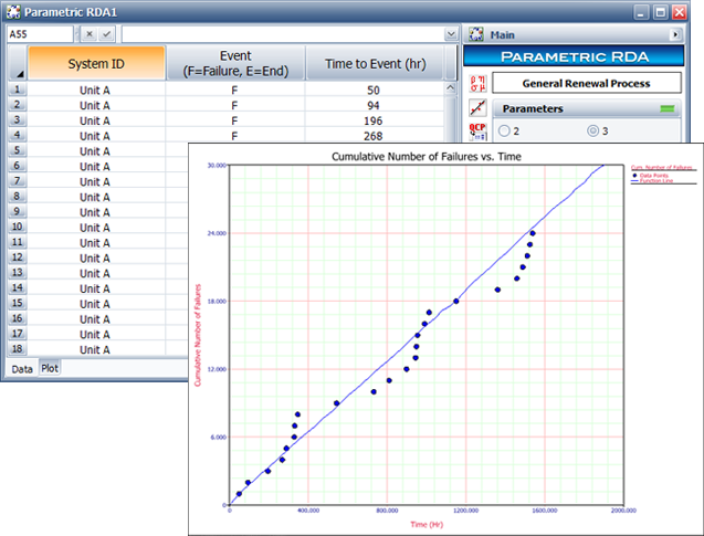 The non-parametric RDA folio uses the Mean Cumulative Function to plot the average number of recurring failures over a given period of time. The parametric RDA folio uses the General Renewal Process (GRP) model, which considers the effectiveness of repairs, to model the cumulative number of failures over time.
