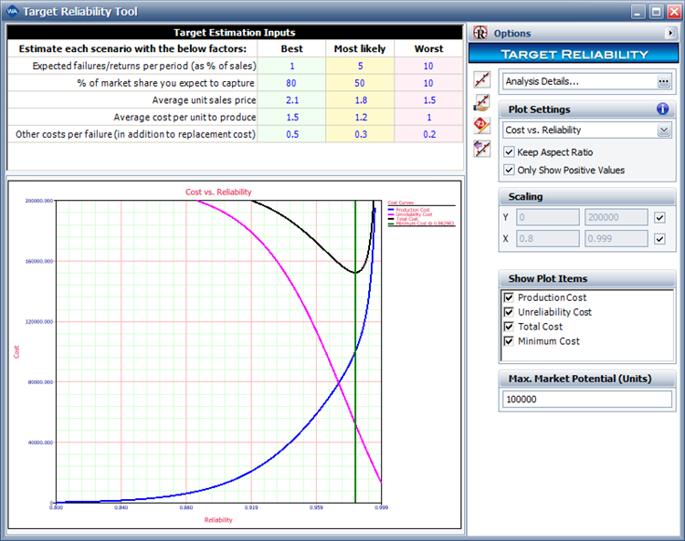 The Target Reliability folio finds the optimum cost and reliability of a product, given estimates for various factors involved in the product’s production and sale.