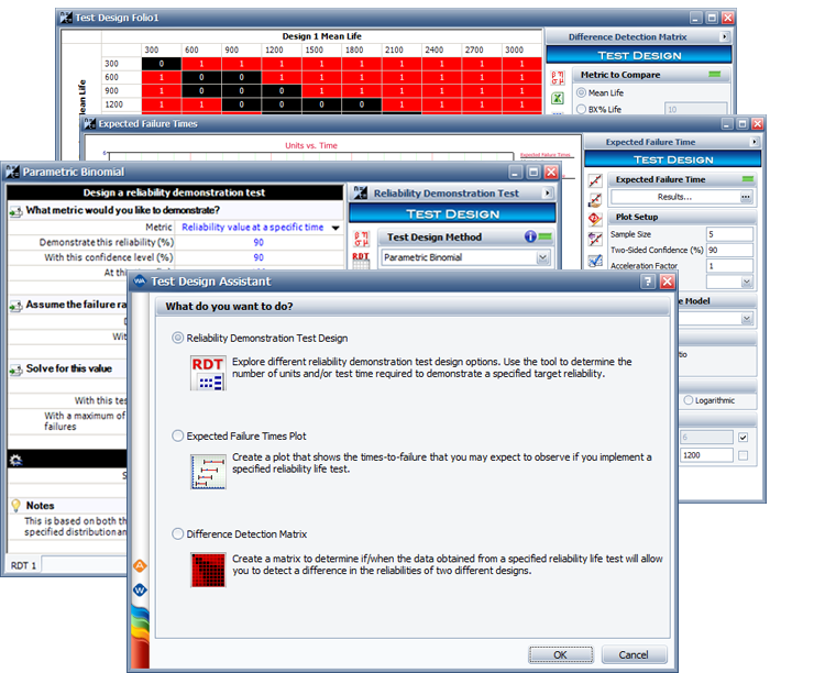 Weibull++ offers a choice of tools to assist with reliability test design: Reliability Demonstration Test (Parametric Binomial, Non-Parametric Binomial, Exponential Chi-Squared or Non-Parametric Bayesian), Expected Failure Times Plot and Difference Detection Matrix.