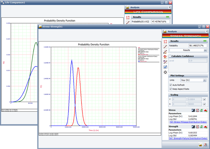 The Life Comparison folio determines the probability that the life of one population will be greater or less than that of the second. The Stress-Strength analysis folio determines the probability of failure based on the probability of stress exceeding strength.