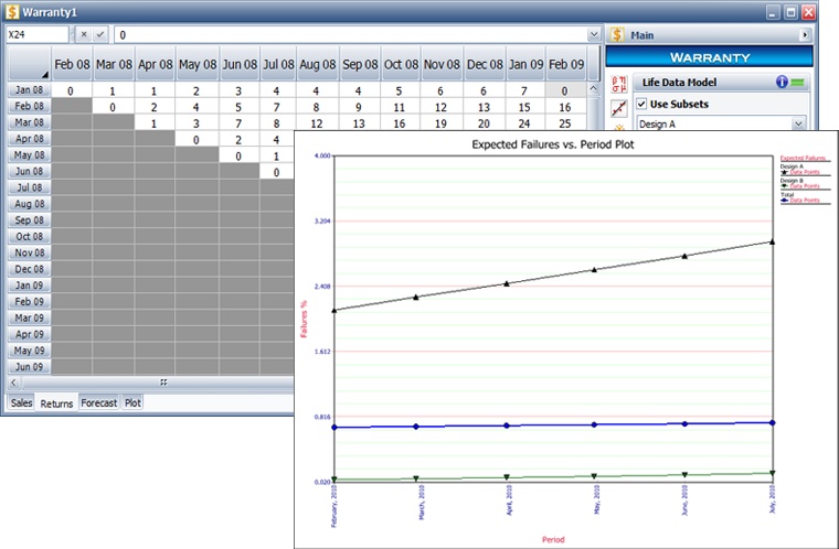The Warranty folio offers a choice of 4 data entry formats that use sales and returns data to predict future returns under warranty: Nevada, Times-to-Failure, Dates of Failure and Usage.