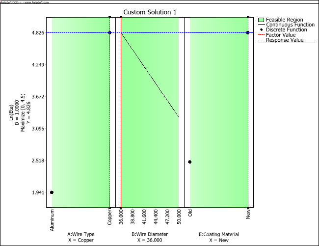 In the plot of a solution, each response selected for inclusion is presented in a separate row and each factor selected for inclusion is presented in a separate column. In addition, a column can be displayed for blocks. By default, the response value is marked with a blue dashed line and the factor settings that yield that response value are marked with red dashed lines. For example, in the plot shown next, the response is being maximized, with a target value of 4.5 or greater. Three factors are included in the optimization. In this solution, the actual response value of 4.826 is achieved by setting factor A (a qualitative factor) to "copper," factor C (a quantitative factor) to 36.000 and factor E (a qualitative factor) to "new."
