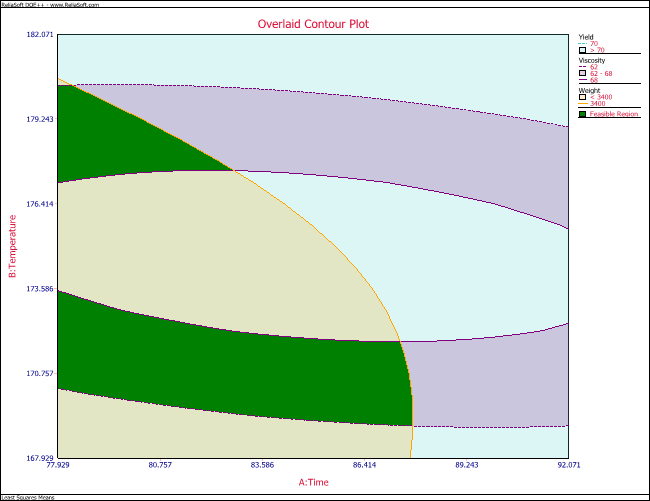 In the plot, the area shown in blue represents all of the combinations of factor settings for the time and temperature factors that will cause the yield to be greater than 70. The areas shown in purple represent the factor setting combinations that will result in a viscosity between 62 and 68. The area in beige represents the factor setting combinations that will give a weight of less than 3,400. Where all three of these areas overlap (i.e., the areas shown in green), the factor settings will give desirable values for all three results.