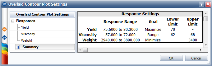 When you first create an overlaid contour plot, you will need to specify the settings that the plot is based on. The Overlaid Contour Plot Settings window will appear automatically. Click each response under the Responses heading and use the Include in optimization drop-down to specify whether the response will be optimized.