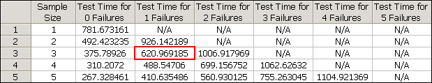 The data sheet shown next displays a parametric binomial table. For example, the second cell in the table tells us that if you used a test time of about 621 hours and no more than one failure occurred during the test, then you would need a sample size of 3 to demonstrate the target metric.