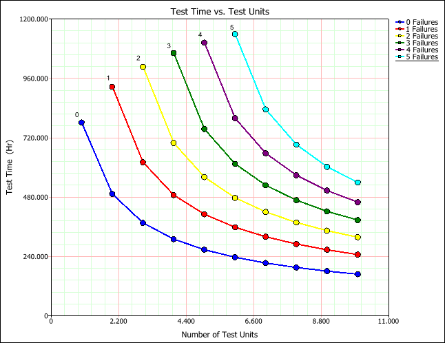 To view a plot of the table results, click Redraw Plot. Each colored line in the plot corresponds to a specific number of failures; this depicts how the allowed number of failures influences the test time and the required sample size.