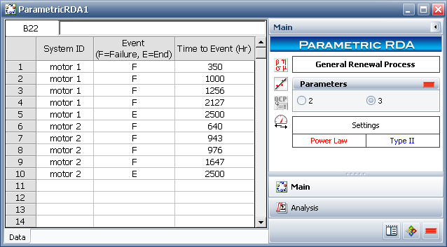 The System ID column identifies the system that experienced an event. In the sample data sheet, two units of the same type of motor are being tracked. The results, such as the mean time between failures (MTBF) and failure intensity, will depict the average behavior of the motors.