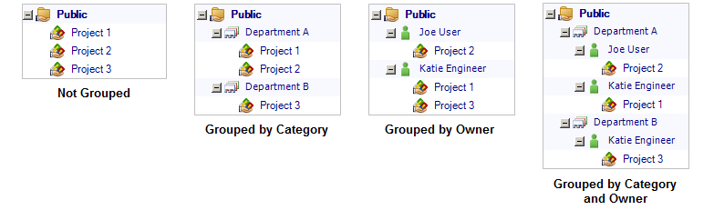 Projects are always grouped based on whether they are public, private or reference. For additional grouping, select the Group by category and/or Group by owner check boxes. If you select both, the results will be grouped first by project category and then by project owner. For example: