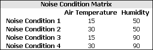 In the Noise Condition 1 column, you would enter the value measured at those control factor settings when Air Temperature = 15 and Humidity = 50. In the Noise Condition 2 column, you would enter the value measured when Air Temperature = 30 and Humidity = 50, and so on.