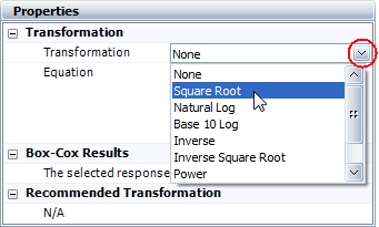 The Select Transformation window allows you to select a transformation to apply to each response. It is accessed by choosing Data > Design > Select Transformation or clicking the icon on the Data tab control panel.