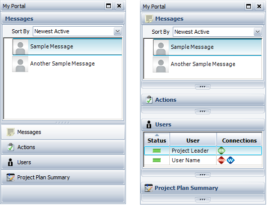 As an example, the first picture shows the My Portal panel when it is not tiled. The second picture shows the tiled panel, with two of the four pages expanded to be visible at the same time.