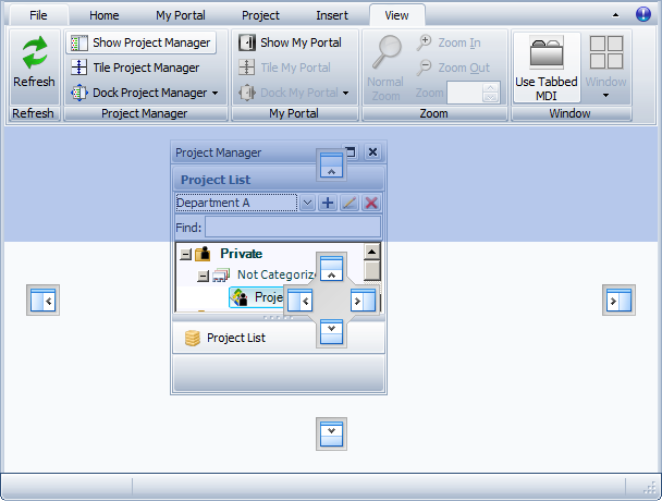 As an example, the following picture shows the Project Manager panel docked on the left side of the MDI, unpinned and hidden, while the My Portal panel is docked on the right side of the MDI, unpinned and visible (either because the user moved the pointer over or clicked the tab).