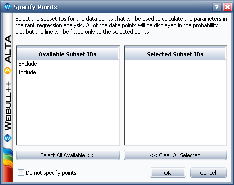 The Specify Points feature enables you to experiment with possible alternative scenarios by allowing you to adjust the way that the line is fitted to the points for a rank regression analysis. The ranks will be calculated based on all of the data points, but the regression line (which determines the parameter estimates) will be fitted only to the points you have specified. Any plots or QCP results will be based on the adjusted line, and therefore may be appropriate only within the context of your specific "what if" analysis.