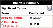 The values of the regression coefficients show that nozzle position and deposition temperature have a negative effect on the variation in thickness.