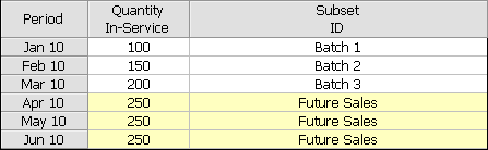 The Quantity In-Service column indicates the number of units that are assumed to have started operating during each period. The general term in-service represents the closest estimate of the time at which each unit started operating in the field. For example, if you have access to both the manufacturing date and the shipping date for a group of parts, you may choose to perform the analysis based on the shipping date because it is a closer indicator of the time the product started operating in the field.