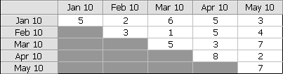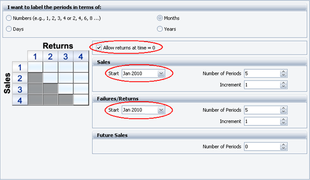 When you enable this setting and click OK, the Returns sheet will allow you to enter returns for the same month in which the units were in-service, as shown next. In this example, 5 units from the January sales were damaged during shipping and were returned within the January sales period. These 5 failures will be treated as zero-time failures. In February, 3 units were also returned within the February sales period. These 3 failures are also zero-time failures. The rest of the chart can be read in a similar manner.