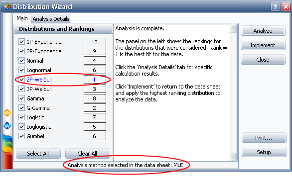In the example shown next, the 2P-Weibull distribution is the suggested distribution for the data set. The parameter estimation method selected in the data sheet (in this case, MLE) is displayed at the bottom of the window.