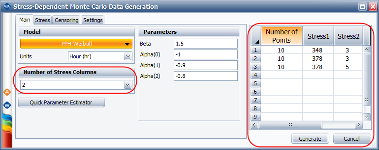 If you select the proportional hazards (PPH), general log-linear (GLL) or cumulative damage (CD) model, the Number of Stress Columns area will be enabled. It allows you to add stress columns to the data sheet on the right side of the window. In the data sheet, specify the value of each stress level and how many data points you want generated for each stress level.