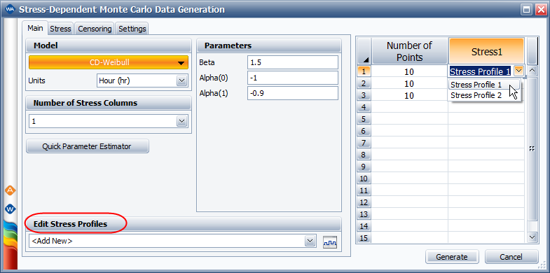 Use the data sheet on the right side of the setup window to specify the stress levels and the number of data points to generate for each stress level.