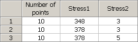 For ALTA's Stress-Dependent Monte Carlo utility, use the data sheet on the right side of the window. For example, if you have selected a multi-stress model, the following settings would generate 10 data points for Stress 1 = 348 and Stress 2 = 3, 10 data points for Stress 1 = 378 and Stress 2 = 3, and 10 data points for Stress 1 = 378 and Stress 2 = 5.
