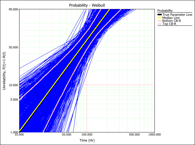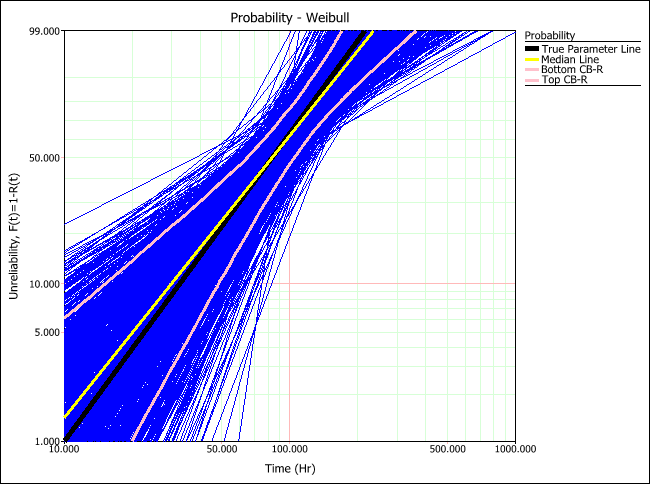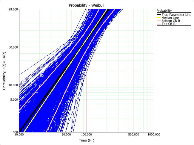 The true parameter line (black) shows the time vs. unreliability defined by the parameters of the distribution that was used to generated the simulated data. The median line (yellow) shows the time vs. unreliability defined by the median parameters of all generated data sets. By comparing these two lines, you can estimate how close the estimated parameters would be to the product's assumed parameters (which you provided in the setup). The plots above show that RRX would provide the least deviation (i.e., "bias") from the truth for this sample size and data type.