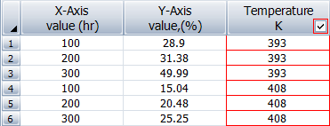 To use this data type, select the Free-form (probit) data check box in the setup window. In the data sheet, enter the values for the independent variable in the X-Axis value column and enter the cumulative percentage of failures in the Y-Axis value column. The following is an example of a data set that shows the effect of time (x-axis data) on the probability of failure (y-axis data) at specified stress levels of a product.