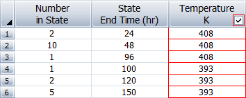 If multiple units failed at the same time, you can choose to enter the data in groups. To do this, select the I want to enter data in groups check box in the setup window. This adds a third column to the data sheet, as shown next. In this example, the units that failed at the same time are grouped together. The Number in State column indicates the number of failed units in that group (the software will automatically enter a 1 if you leave this cell blank) and the State End Time column indicates the exact time the units in each group failed.