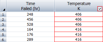To use this data type, select the Times-to-failure data check box on the setup window. Your data sheet will have a Time Failed column for recording the times-to-failure. The example shown next displays a life-stress data folio data sheet where all the units in the sample failed. The exact time of each failure is recorded.