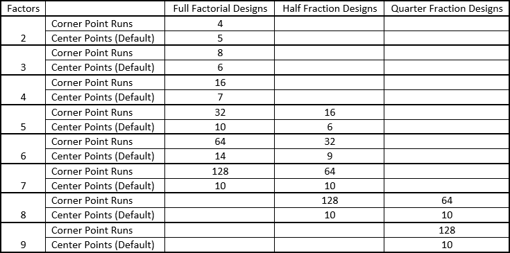 This table provides information about how many corner point (i.e., factorial) runs will be used in the design, based on the number of factors and the selected fractionality of the design, as well as how many center points will be used by default when a single block is used. For example, if you are using 5 factors and have selected a full factorial design, the design will use 32 corner point runs and will use 10 center points by default, provided that only a single block is used. If you are using 5 factors and have selected a half fraction design, the design will use 16 corner point runs and will use 6 center points by default, provided that only a single block is used.