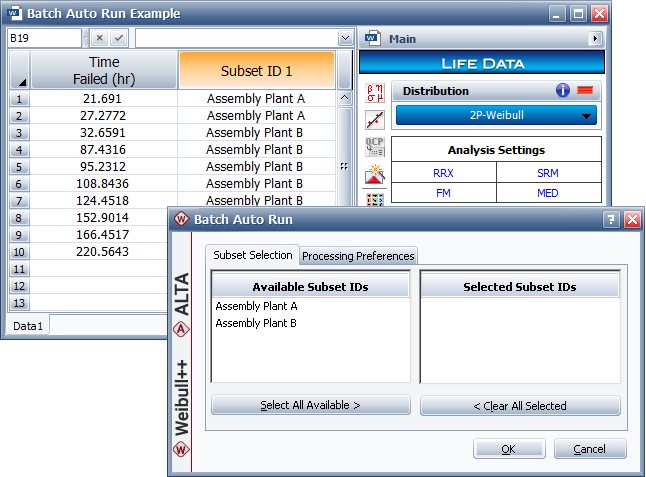 The Batch Auto Run utility allows you to extract data subsets from an existing data set. For example, consider a data sheet that contains the failure times for a product manufactured in two different plants. By using Batch Auto Run, you can filter the data by manufacturing plant and then analyze the failures from each plant separately.