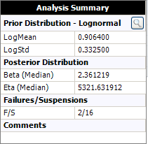 Note that instead of a single calculated value for each of the parameters, the parameters of the Bayesian-Weibull distribution are distributed. This result is known as a posterior distribution. In the example, the result showing that Beta (Median) = 2.3612 means that the median value of the posterior distribution of the beta parameter is 2.3612. For convenience, this is used as the single point estimate for the beta parameter.