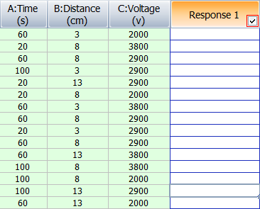 Response Columns allow you to enter the response(s) for each test run. A response column heading will include the response name and (if specified) units you have defined on the Design tab.