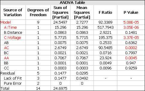 In the ANOVA table, you can see that effects A, C, AC and AA are significant. The p value for factor B is 0.1481, which is close to the risk level of 0.1. Therefore, you decide to include it in the final model.