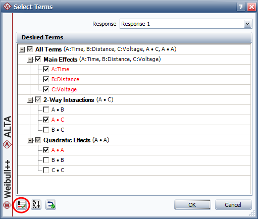 In the Select Terms window that appears, click the Select Significant Effects icon to select only the significant effects to calculate the new model, and also select the check box for term B, as shown next, then click OK.