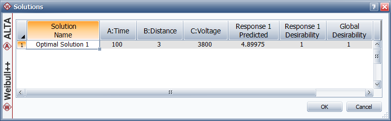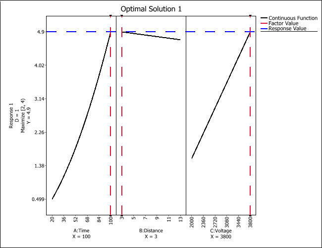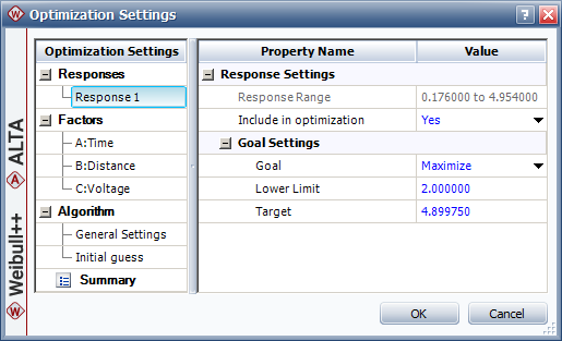 In the Response Settings window that appears, use the settings shown next and click OK. These settings indicate that you want to maximize Response 1, with values above 4.89975 being considered 100% desirable and values below 2 being undesirable.