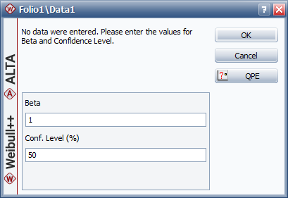To use the 1-parameter Weibull distribution, you will be prompted to enter the shape parameter, beta, as well as the lower one-sided confidence for the scale parameter, eta.