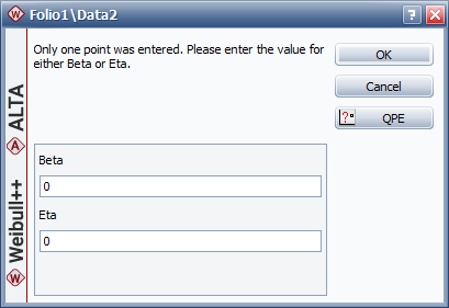 If you select to use a 2-parameter distribution, you will then be prompted to enter a value for one of the parameters. Remember that when using free-form data, you are supplying both the X and Y position for the entered data point. Given this point and a value for one of the parameters, the application will then solve for the other parameter. The parameter that you would like to solve for should be left as zero as shown below.