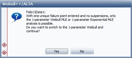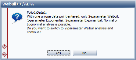 With only one unique data point, only the 2-parameter Weibull, 1-parameter exponential, 2-parameter exponential, normal and lognormal analyses are possible. If you select a different distribution, a message box will appear notifying you that you need to switch analysis types, as shown next.