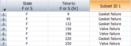 Consider a water pump that is considered failed when either its gasket or its valve fails. To use CFM analysis in a Weibull++ life data folio, you must categorize each failure time into distinct subset IDs. The following data sheet shows the categorized failure times.
