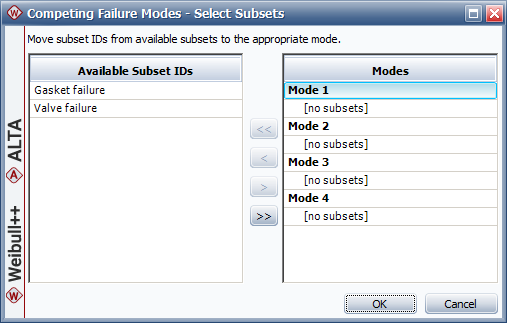Assign "Gasket failure" to "Mode 1" and "Valve failure" to "Mode 2," and then click OK. Weibull++ will automatically calculate the parameters for each mode separately.