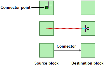 In both methods, the pointer will change to display small crosshairs. Click the source block, hold down the left mouse button and drag a line from the source block to the destination block. When the crosshairs are located over the connection point box, release the mouse button to create a connector.