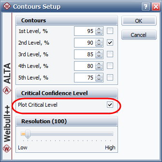 In Weibull++, contour plots are available only for the 2- and 3-parameter Weibull, normal and lognormal distributions. The first time you select a contour plot from the Plot Type drop-down list, the Contours Setup window will appear. This window allows you to select: a) the number of contour lines to be shown, b) the confidence level represented by each selected line, and c) the resolution used to draw the lines.