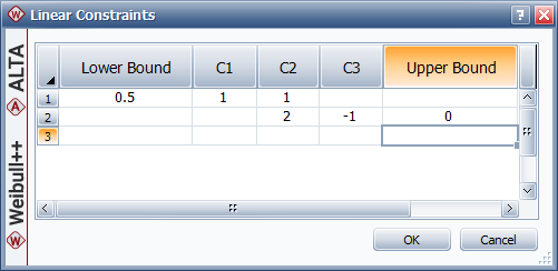 Each row in the Linear Constraints window represents an equation that defines a single constraint. The first and last columns represent lower/upper bounds of the constraint, and the middle columns represent the coefficients of each component in the blend (the column headers show the abbreviated factor names). If a constraint lacks a lower or upper bound, or if there certain components that are not considered, you can leave those cells blank.